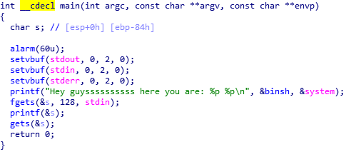 2개의 주소를 주는데 binsh 와 system 함수 주소를 줍니다.