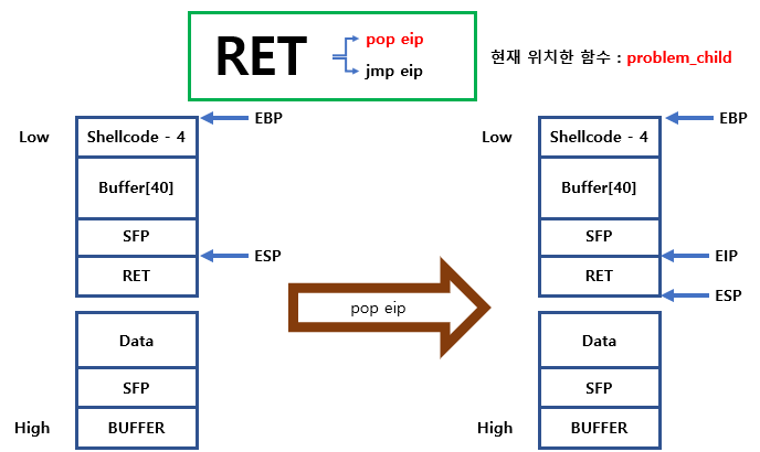 leave 명령어를 지나면 ret 명령어가 나오는데 ret 내부 명령어중 하나인 pop eip를 하게 되면 pop을 하기 때문에 RET(EBP+4)에 EIP가 자리잡게 되고, ESP는 EBP+8로 이동하게 됩니다.