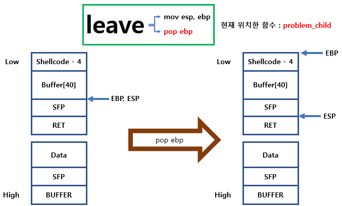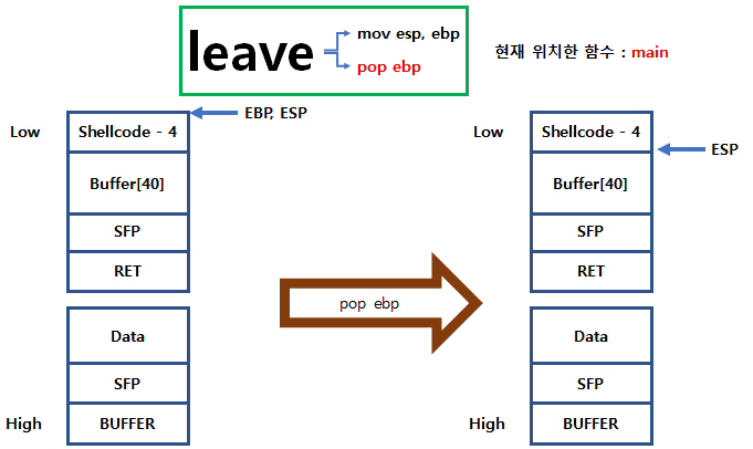 leave 명령의 내부에 존재 하는 pop ebp를 하면 ebp(SFP)에 있는 주소로 ebp가 이동하게 됩니다.