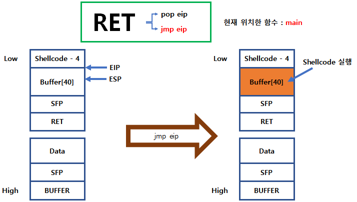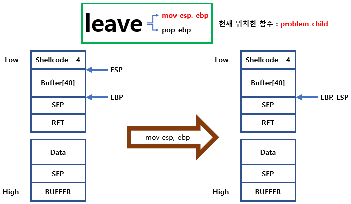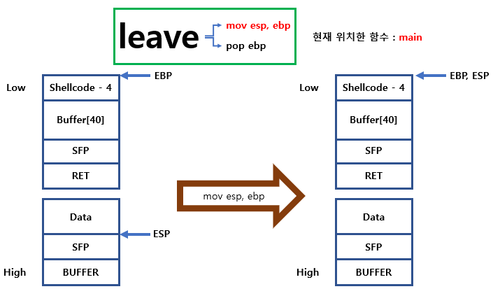 leave 내부 명령인 mov esp, ebp 를 실행하면 EBP를 따라서 Shellcode를 넣은 Buffer주소+4 위치에 놓이게 됩니다.