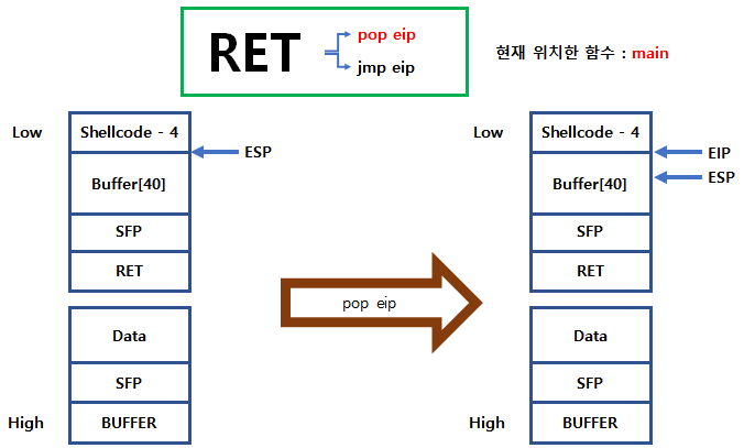 SFP에 Buffer의 첫 주소-4 의 주소 값이 들어가 있기 때문에 pop ebp를 하면 ebp가 Buffer-4로 가게 되고, ESP는 pop을 했기 때문에 EBP+4 로 이동했습니다.