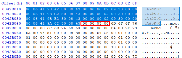 이번에는 moov 시그니처가 나옵니다. 해당 시그니처의 사이즈는 0x500 입니다.